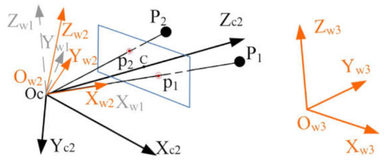 We rotate the world frame O_ZYZ_w1, point P1, and P2 around the Xw1-axis. With this rotation the relative pose between the world frame and point Pi is unchanged, while the relative pose between the world frame and the camera frame is changed.