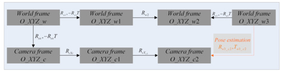 (3) Estimate the absolute orientation. Several frames are involved in our proposed method, and now the transformations between each are known, except for the transformation between the world frame