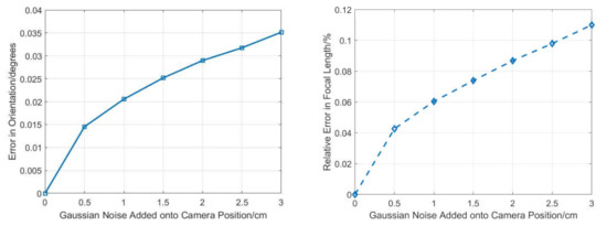 Figure 8, we can see the orientation error and focal length error increase with the increase of camera position error. However, the max errors in orientation and focal length when the camera position error is 3 cm were both low, which means our proposed method has good robustness to camera position noise and still yields good results, even though camera position error existed.
