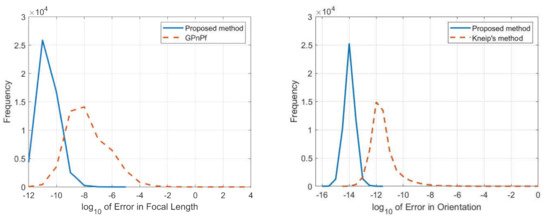 In this section, 50,000 trails were performed independently and there was no noise added to the 2D–3D point correspondences. The log10 value of the relative error between the ground truth and the focal length, estimated using our proposed method and GP4Pf, respectively, is shown in