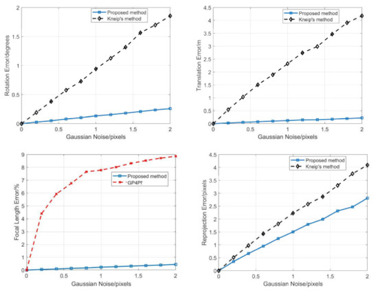 Figure 10, in terms of the rotation and translation error, our proposed method performed much better than Kneip’s method, while it was slightly better in terms of reprojection error. In terms of the relative focal length error, our proposed method performed much better than the GP4Pf. Moreover, as the noise increases, the performance superiority of our proposed method over the other methods became more obvious.