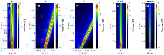 Acoustic pressure distribution simulation performed during specification phase of the MoUsE transducer. (a–c) Plane wave transmission under different angles to investigate the steering capabilities and the identify potential grating lobes, (d,e) single element elevational sound field without focusing (d) and with lens focusing to 60 mm (e).