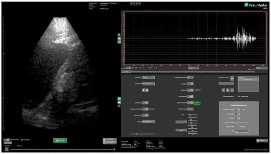 Image reconstruction is performed in real-time using a GPU (OpenCL, Khronos Group, Beaverton, OR, USA)-based implementation of plane wave compounding [] approach in the in-house developed clinical style user interface USPilot (Figure 3). Other reconstruction methods can easily be implemented via an SDK. The number of plane wave angles, as well as the increment can be freely selected by the user. Other transmit parameters such as the frequency, the burst count or the voltage can be adjusted as well. On the receive side, the data sampling rate, averaging factor and TGC can be selected.