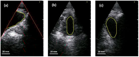 Ultrasound imaging is a frequently used method for postoperative monitoring of the urinary bladder. Depending on the surgical context, different clinical conditions that need close monitoring can occur. Post-operative urinary retention (POUR) is a frequent problem for various reasons (e.g., intravesical blood clotting) that can lead to bladder overdistension and needs rapid detection and medical intervention. On the other hand, invasive procedures such as catheterization present significant discomfort for patients and can lead to infections or even trauma of the urinary tract. In contrast, ultrasound imaging is fully non-invasive and has already shown its potential for bladder monitoring [,,]. Accurate bladder volumes can be extracted from 3D ultrasound data; however, reliable qualitative information about potential bladder overdistension can already be derived from 2D B-mode (brightness mode) ultrasound images.