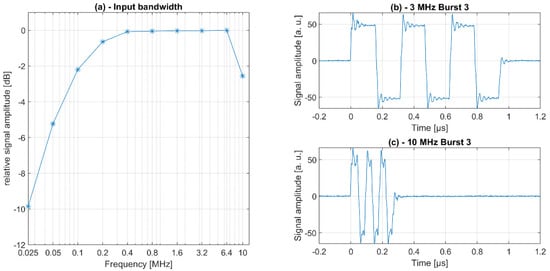 The transmit and receive paths of the electronics were characterized with respect to the bandwidth. First, for the assessment of the transmit bandwidth, an 80 mVpp sinus signal of varying frequency from a signal generator was digitized by the electronics and the amplitude of the digitized signal was characterized (Figure 5a). As can be seen, the input bandwidths significantly decrease below 100 kHz and above 10 MHz. Furthermore, we evaluated the signal fidelity by generating rectangular bursts of 3 cycles at different frequencies (Figure 5b,c). The electrical signals were measured on the connector PCB with an oscilloscope and minor overshooting was observed.