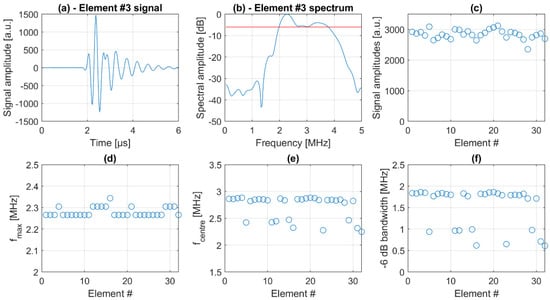 Analysis of transducer performance by charaterization of pulse-echo data from a steel reflector. Single element signals in time (a) and frequency (b) domain, where the red line depicts the −6 dB threshold. Element sensitivity statistics (c), maximum frequency, center frequency and bandwidth statistics (d–f).