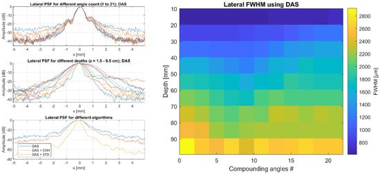 The FWHM (Full Width Half Maximum) was characterized as a function of depth (wires in distances between 1 cm and 10 cm from the transducer aperture) and as a function of the number of compounding angles (from 1 to 21). Furthermore, different beamforming approaches were investigated from conventional delay and sum (DAS) to coherence beamforming (COH) [,] or non-linear filter approaches based on signal statistics (STD) [].