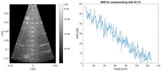 B-mode image acquired with 21 compounding angles used for calculation of the SNR (left). Depth-dependent SNR of compounded data (right).