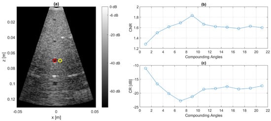 Plane wave compounding data were acquired with a varying number of angles between 1 and 21. The metrics were then assessed as a function of the number of compounding angles. For this purpose, the mean values µ and the standard deviation σ inside defined image regions (red circle: lesion; yellow circle: background in Figure 9a) were calculated.