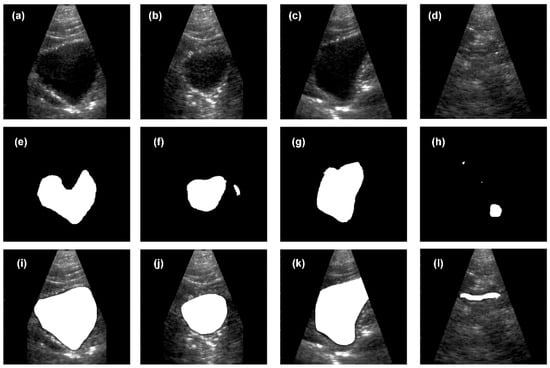 To validate the quality of the trained CNN, ultrasound B-mode images from human bladders with different filling levels were acquired from four male volunteers with the MoUsE system. In this first study, 20 data sets (each consisting of one reconstructed B-mode image) were collected. None of these data sets is included in the 253 data sets used for training of the CNN. For image acquisition, an ideal position for the probe on the abdomen was identified based on the real-time feedback of the MoUsE system. Images of the bladder at different filling levels were then acquired with the probe at this position. When it comes to the beamforming approach, plane wave compounding with 21 angles was chosen. Examples of different bladder images can be seen in Figure 10a–d. In a second step, the images were automatically segmented using the above-described CNN. Examples of the segmentation for four different data sets are given in Figure 10e–h, where different situations can be identified. In Figure 10e, the upper part of the bladder, which is closest to the probe, is not identified as part of the bladder by the CNN. This might be due to clutter signals in this part of the image. In Figure 10f, the bladder is correctly segmented; however, an additional surface, which does not correspond to the bladder, was identified as bladder tissue. Figure 10g represents an ideal case with a high correlation between the ground truth and the CNN-segmentation. Finally, Figure 10h shows a case where the bladder was not found by the algorithm due to the really low contrast between the (compressed and almost empty) bladder and the surrounding tissue, as can be seen in Figure 10d. Examples of the ground truth segmentation for the cases presented above are given in Figure 10i–l.