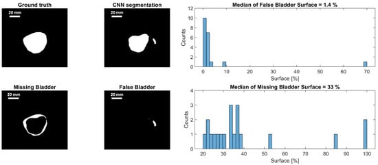 Statistical analysis of the accuracy of bladder segmentation and example of one segmentation highlighting the differences between the expert ground truth and the CNN segmentation. Areas not recognized as bladder by the CNN are marked as “missing bladder”, areas erroneously segmented as bladder by the CNN are marked as “false bladder”. The relative fractions of “missing” and “false” bladder in the different segmented data sets are shown as histogram in the right column.