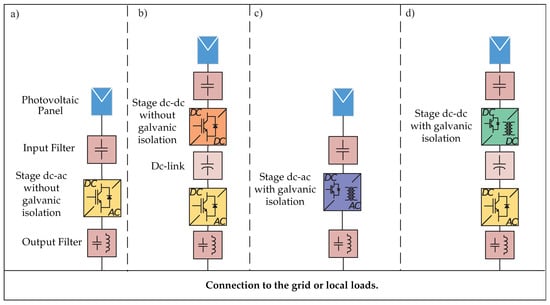 Classification of microinverters. (a) One-stage topology without galvanic isolation. (b) Two-stage topology with galvanic isolation. (c) One-stage topology with galvanic isolation. (d) Two-stage topology with galvanic isolation.
