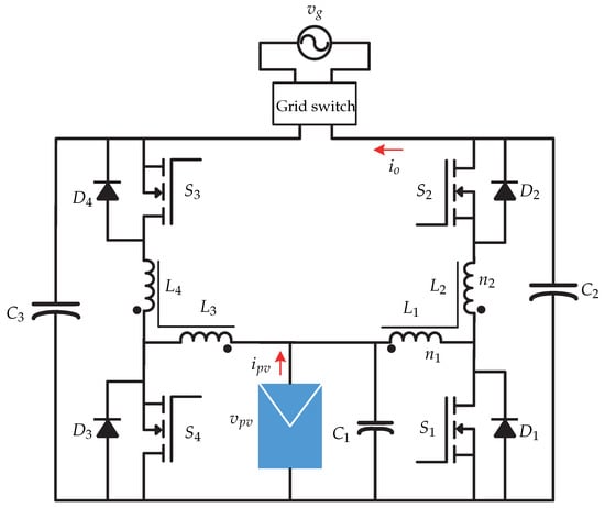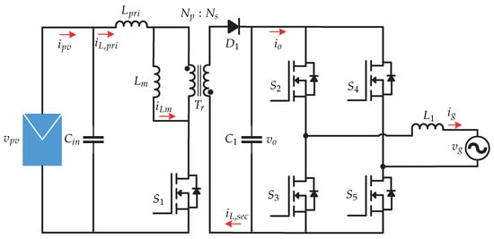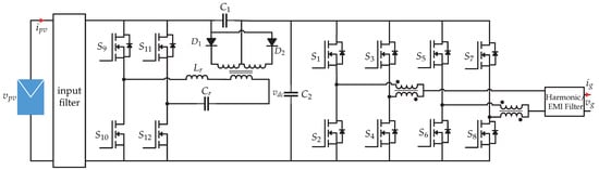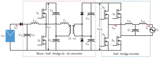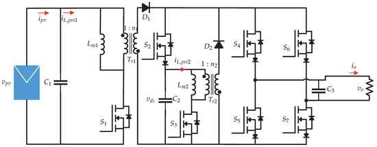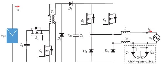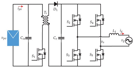 Microinverters can be classified into four categories [,], such as: one-stage topology without galvanic isolation; two-stage topology without galvanic isolation; one-stage topology with galvanic isolation; and two-stage topology with galvanic isolation.