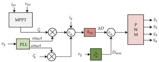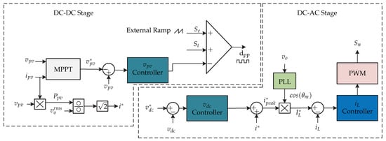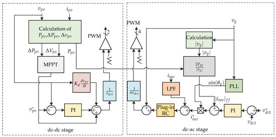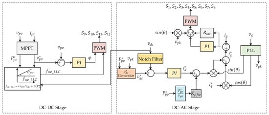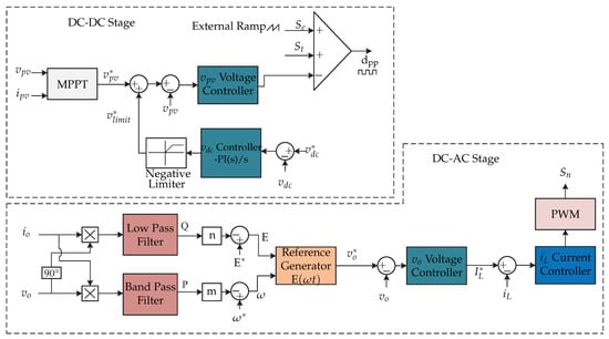 In [], a microinverter is introduced and provides Volt/VAR support to the power grid. The microinverter consists of a first stage with a partial power LLC resonant converter followed by an interleaved full-bridge inverter (Figure 26). The control strategy is presented in Figure 27. First, there is an MPPT algorithm to extract the maximum power from the photovoltaic panel and generate the reference voltage , which is compared to the voltage of the photovoltaic panel . The error is processed by a PI controller and generates the phase-shift angle . In addition, to minimize the phase-shift angle, a switching frequency feedforward loop is implemented, which is generated by the voltage of the dc link , by the output power of the photovoltaic panel and by the reference voltage of the photovoltaic panel. This allows the dc-dc converter to change its switching frequency to maintain soft switching as well as to obtain an appropriate gain. In the dc-ac stage there is a double loop control. The outer voltage loop consists of the dc-link voltage regulation and is compared with a dc reference voltage obtained from a generator as a function of the output power of the photovoltaic panel and the voltage . The error is minimized by a PI controller that generates the reference current in the d-frame . Then, a feedforward loop in terms of the output power of the photovoltaic panel and the voltage is added to the reference current. Both currents are added in d and q frame to generate the reference current . Then the reference current is compared with the grid current and the error is minimized by a PI and resonant control (RC) to generate the duty cycle of the inverter.