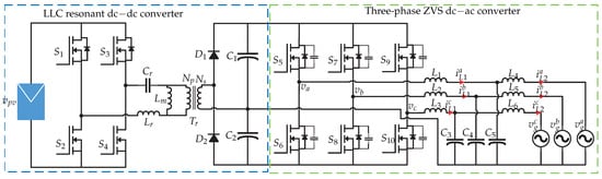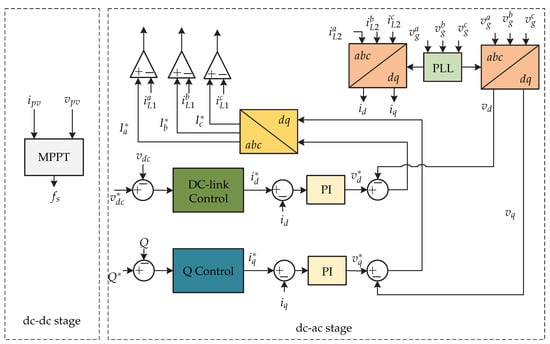 The references [,] present a dual-stage microinverter, where in the first stage is an LLC resonant dc-dc converter and in the second stage a three-phase zero-voltage-switching (ZVS) dc-ac converter (Figure 6). The variables to be controlled in the microinverter are the inductor currents ( and ) used as a filter, the dc-link voltage and the currents injected into the grid (). Figure 7 presents the control strategy. The objective of the dc-dc converter is to track the maximum power point by means of an MPPT algorithm, whose function is to define the switching signal based on the power of the photovoltaic panel. In the dc-ac stage, the proposed control strategy is that of a triple loop controller. In order to balance the power of the photovoltaic panel and the power of the electrical network, it is necessary to have a constant dc-link voltage. This is done by comparing the dc-link voltage with a reference and the result is controlled by a dc-link controller that generates the current reference in the d-frame and is compared with the current obtained by the transformation. The result is controlled by a PI controller that generates the voltage reference in the d-frame which is sum to the grid voltage. The Q control is not explained in [] because reference current in q-frame is considered zero. On the other hand, the reference current compared with the grid current in the q-frame is controlled by the mean of a PI controller to generate the reference grid voltage in the q-frame which is which is the reference for the sensed grid voltage . Then, the reference three-phase current ( and ), and then it is compared with the inductance currents () in order to generate the switching sequence.