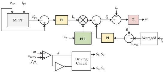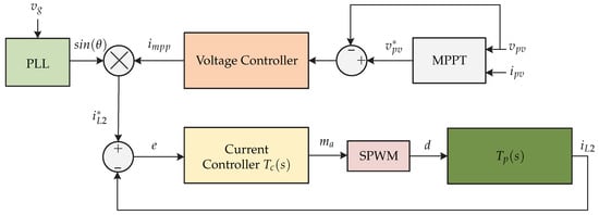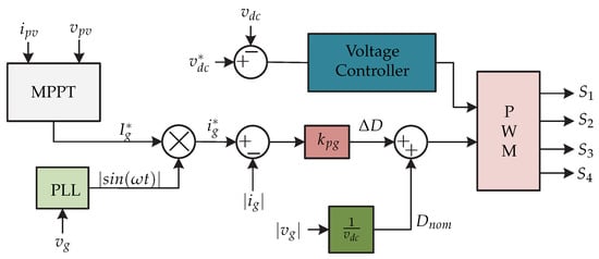 In [] a single stage dc-ac microinverter is presented consisting of a coupled-inductor double-boost inverter (Figure 16). The main characteristics are: simple structure, generation of an ac output in magnitude greater than the dc signal, small volume, and high efficiency. The control strategy is presented in Figure 17. The control consists of an MPPT P and O algorithm where the reference voltage of the photovoltaic panel is obtained and it is compared with the photovoltaic panel voltage , whose error is processed by a PI voltage control to generate the current amplitude . The amplitude is multiplied by a sinusoidal signal, whose angle is obtained from a PLL for synchronization with the grid, obtaining the reference of the output current . The reference is compared with the output current and enters a current controller proposed in [] and allows canceling the dc components of the inductor current, as well as canceling some poles and zeros of the proposed converter model.
