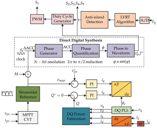 In [,,,] a microinverter (Figure 12) based on a direct digital synthesis technique is presented for operation in grid-connected mode. This technique provides flexibility in implementation of various controls such as MPPT, PLL, anti-island, and low-voltage ride-though (LVRT). The control strategy is presented in Figure 13 and consists of the MPPT algorithm based on the constant voltage method (CVT) for the dc-dc stage, which requires sensing the voltage and current of the photovoltaic panel ( y ). The MPPT algorithm generates the voltage at the maximum power point and it is compared with a reference voltage and the error is processed by a PI controller that generates the d frame current (). On the other hand, the grid voltage and the grid current are sensed to generate the currents and voltages in frame that are used by a power estimator. The output of the estimator is the Q reactive power which is compared with the reference reactive power . The error is processed by a PI controller that generates the current in q frame (). Then, the frame currents are transformed to the frame. In summary, the d component regulates the output voltage and the q component determines the reactive power to be injected into the grid.