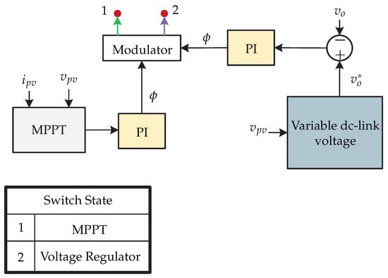 In [,], the study of the dc-dc stage of a microinverter is presented, which is suitable for connecting it to a dc-ac stage and integrating it with the grid (Figure 18). A topology of a dual-mode rectifier (DMR) based series resonant dc-dc converter is proposed and its characteristics are: ability to operate in a wide variety of voltage inputs and high efficiency. The control strategy proposed for the dc-dc converter is presented in Figure 19 and its main characteristic is its variable dc-link voltage control, with the aim of reducing RMS (root mean square) currents, improving the efficiency of the microinverter. In addition, it is characterized by being a flexible control, since it has two modes of operation. For the case of the control of the MPPT, Mode 1 will be applied. The MPPT algorithm is executed and the voltage reference is compared with the voltage of the photovoltaic panel . Then the comparison result is processed by a PI control to get (inverter controls the dc-link). In Mode 2, the switch connects the dc source and disconnects the photovoltaic panel. Then, the variable control is executed which generates the reference voltage of the dc link and is compared with the output voltage . Finally, the result of the comparison is processed by a PI control to obtain the value of . The switching sequence is generated by the modulator depending on the operating mode of the microinverter.