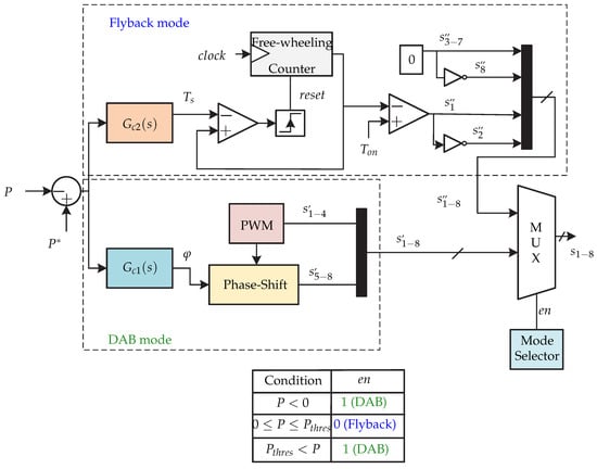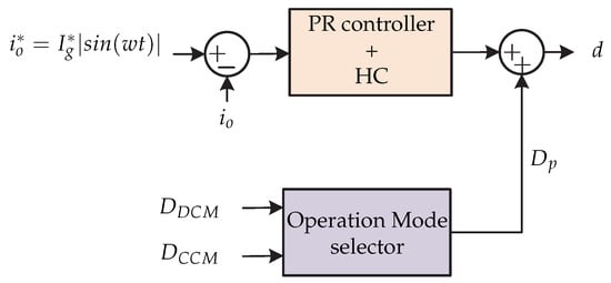 In [] a control strategy for a two-stage topology is presented. In the first stage, it contains a flyback dc-dc converter and in the second stage it contains a full-bridge inverter (Figure 20). A microinverter with hybrid mode is presented and consists of a control strategy that allows the system to operate in both continuous and discontinuous mode. The advantages of operating in hybrid mode is the stress reduction faced by the primary and secondary part of the transformer []. The control strategy is presented in Figure 21. The proportional-resonant controller (PR controller) plus the harmonic compensator (HC) provide a high gain in the fundamental frequency and harmonics, in order to improve the performance of the discontinuous mode and the stability of the continuous mode of the flyback converter. In addition, the hybrid duty cycle obtained by means of the operating mode selector allows for the elimination of disturbances and reduces the load on the feedback controller.