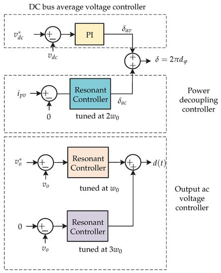 In [] a microinverter is presented and it consists of a high frequency dc-ac converter based on a dual active bridge (DAB) operating with zero-voltage-switching (ZVS) (Figure 22). The control strategy is presented in Figure 23 and it consists of three objectives: dc-link voltage regulation, power decoupling, and ac output voltage regulation. First, the dc voltage is regulated by a PI controller that generates the average phase shift signal . The result is added to the ac offset signal to generate the offset signal . Second, a power decoupling controller generates the ac phase shift . It consists of a resonant controller to eliminate oscillations. Finally, two resonant drivers regulate the output ac voltage and are adjusted to reject third order harmonics and to compensate for the effects of second order.