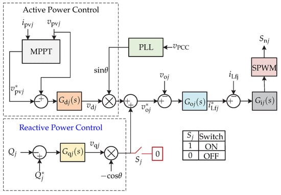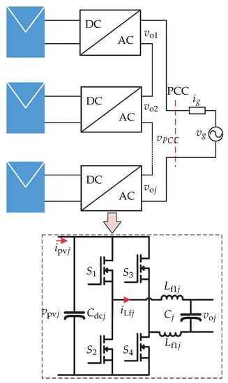In [] a series configuration of microinverters consisting of cascaded full-bridge inverter is presented, where each full-bridge inverter is connected to a single photovoltaic panel (Figure 28). A distributed control strategy is proposed for each independent microinverter, in which the power is shared between the different inverters depending on the power available in the photovoltaic panels and the reactive power is controlled by a single microinverter. The control strategy is presented in Figure 29, whose objectives are: active power regulation, reactive power regulation which entails voltage, and current regulation. The control strategy first consists of an algorithm for tracking the maximum power of the photovoltaic panel to generate the reference panel voltage . The reference voltage is compared to the voltage of the sensed photovoltaic panel . The result is processed by a PI controller and generates the voltage in the d-frame that is multiplied by a sinusoidal generated by a PLL of the voltage in the Point of Common Coupling. This generates the reference output voltage . The reference output voltage is compared to the sensed output voltage of the inverter and it enters a PR controller to generate the reference inductor current . This reference is compared to the sensed inductor current and it enters a PR controller to generate the modulator of the commutation sequence. The switch determines the activation of the reactive power control. The reactive power is then compared with the reference reactive power and the result is processed by a Proportional (P) controller and it generates the voltage of the q frame multiplied by . The result is added to the voltage in the d-frame to obtain the output voltage reference .