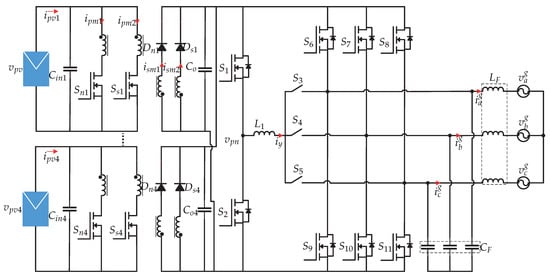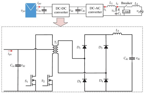 Figure 1 shows the configuration of each category. In a two-stage topology, it consists of a dc-dc converter that performs the MPPT, and the dc-ac converter has the responsibility of controlling the dc-link and the control of the grid current or properly controlling the output voltage in island mode. In terms of control, the two-stage topology is simple, and the dc-dc converter also extends the operation of the photovoltaic system, leading to a decrease in overall efficiency []. One-stage topologies are introduced to reduce power losses and reduce the total system volume [].