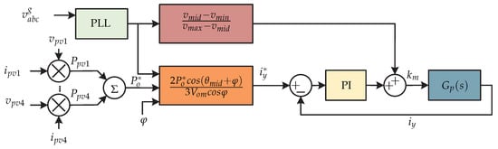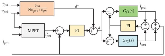 In [] a dual-stage microinverter without capacitors is proposed, whose dc-dc stage consists of two interleaved flyback dc-dc converters and a third harmonic current injection circuit. The dc-ac stage has a three-phase current source inverter switched at line frequency and an LC output filter (Figure 30). The flyback converter controls the MPPT and the third harmonic current injection circuit regulates the power factor correlation. In Figure 31 the control strategy for the dc-dc stage is presented. On the one hand, there is the Perturb and Observe MPPT algorithm that generates the reference input current of the flyback converter (outer voltage loop), and then a PI controller (inner current loop) regulates the error to generate the modulator d. and are the transfer functions of the first flyback converter and the second flyback converter respectively. To achieve a balance of power between the interleaved converters, a PI controller is used. The difference between the average input current of the primary flyback converter and secondary flyback converter ( y ) goes into a PI controller; the output is added to the duty cycle of the first flyback converter and is subtracted from the duty cycle of the second flyback converter. The photovoltaic panel current is equal to the sum of the currents of the primary flyback converter and secondary flyback converter. Figure 32 shows the control strategy of the current injection circuit and it consists of a PI current controller that compares the inductor current of the third harmonic () with a reference current . The reference current is obtained by the angle of the grid voltage (generated by a PLL), plus the reference power (obtained by the sum of all the electrical powers of the photovoltaic panels), plus the desired output angle . is the transfer function of the current injection circuit of the third harmonic.