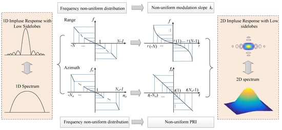 Both NLFM and ANUS could overcome the limitation between the low SLL and the SNR reduction due to window weighting in focusing processes. Based on this phenomenon, the starring spotlight mode with NLFM and ANUS for low sidelobe imaging is proposed as shown in Figure 5. The radar continuously transmits the NLFM waveform to the imaged area with the non-uniform PRF, while the operated PRF is high in the middle and low in both ends of the SAR raw data acquisition interval. The 2D PSD shape of the prosed imaging mode is similar to the 2D weighting window function, which corresponds to the 2D impulse response with low sidelobes as shown in Figure 1.