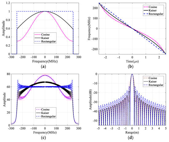 where is the roll-off coefficient of the raised cosine window function. Figure 2 shows the NLFM waveform design results with different window functions. According to (2), different range time-frequency relationships are obtained from different window functions as shown in Figure 2b, while the rectangle function is related to the LFM waveform. When cosine and Kaiser window functions are introduced to generate the NLFM waveform, the resulting nonlinear range time-frequency relationship is obtained as shown in Figure 2b, and their corresponding spectra and pulse compression results are shown in Figure 2c,d respectively. Compared with the pulse compression result of the LFM waveform, the SLL is obviously reduced.