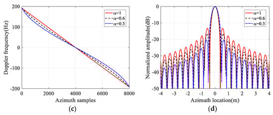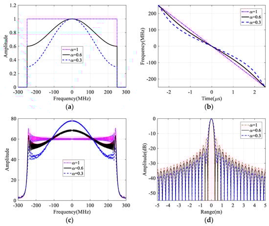 Since the cosine window function is widely adopted in practice for SAR imaging processes, Figure 3 shows NLFM waveform design results based on the cosine window function with different roll-off coefficients, while the roll-off coefficient α of the cosine window function is 1, 0.6, and 0.3, respectively. With the decrease of the roll-off coefficient, the time-frequency nonlinearity is more obvious, which results in the wanted low SLL as shown in Figure 3. Therefore, the non-uniform range frequency distribution could be obtained and adjusted by the chosen window function, and then the instantons frequency modulation rate is continuously changed during the whole NLFM generation interval as shown at the top of Figure 1, which brings a low SLL without amplitude weighting and avoid the SNR reduction in the final compressed result.