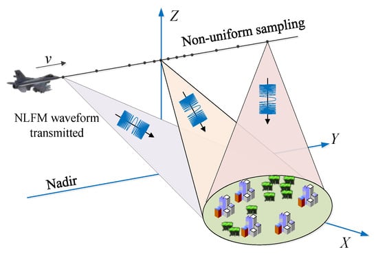 where ka is the azimuth modulation frequency rate, v is the radar sensor velocity, θs is the squint angle, λ is the wavelength, and R0 is the slant range from the targets to the sensor flight path. The non-uniform sampling time of the azimuth can be obtained according to the azimuth modulation frequency rate.