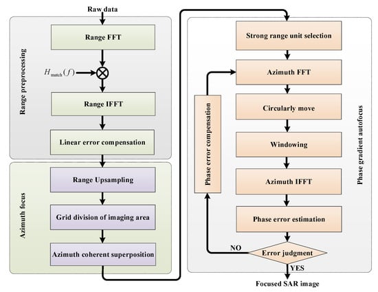 Furthermore, in airborne SAR imaging, motion compensation (MoCo) must be considered during SAR focusing. The BPA with MoCo for the proposed imaging mode is shown in Figure 7. After range pulse compression, the preliminary linear offset error is taken according to the radar platform trajectory information compensation, which is obtained through the inertial navigation system []. After azimuth coherent superposition for each pixel in the imaged scene, the coarse focused complex image is obtained, and the residual azimuth modulation phase error is compensated through the phase gradient autofocus (PGA) algorithm [,]. In the PGA algorithm, the range units with high signal-to-clutter ratio (SCR) are selected to improve the azimuth phase error estimation accuracy. After azimuth tast Fourier transform of the selected range units, the azimuth spectrum is circularly moved towards the Doppler centroid, and window filtering of the resulting data removes clutter signals and improves the SCR. After circular shifting and windowing, the linear unbiased minimum variance is used to calculate the phase error gradient after the inverse Fourier transform, and the well focused SAR images are output while the phase error is less than the designed error threshold.