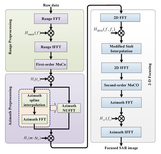 As shown in Figure 8, the range preprocessing step includes NLFM pulse compression and the first-order MoCo. In airborne SAR imaging, MoCo must be considered to improve focusing performances, and the two-step MoCo method is widely adopted in multiple airborne SAR imaging modes [,]. After range frequency matched filtering with (19), the first-order MoCo is carried out to eliminate range-dependent linear motion errors.