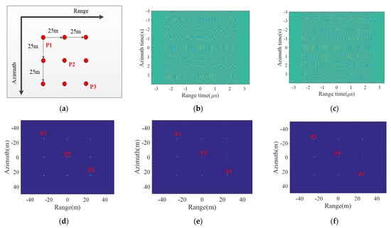 Imaging results of the designed scene with nine point targets. (a) The designed scene with nine point targets. (b) Real part of echoes in the conventional starring spotlight mode. (c) Real part of echoes in the proposed starring spotlight mode. (d) Focused image in the conventional mode. (e) Focused image with window weighting in the conventional mode. (f) Focused image in the proposed mode.