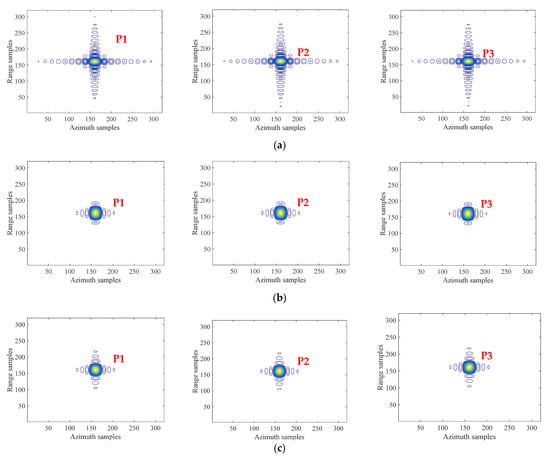 Contour plots of three point targets P1, P2, and P3 in Figure 9 are shown and compared in Figure 10, and their corresponding measured focusing parameters including geometric resolution, peak sidelobe ratio (PSLR) and integral sidelobe ratio (ISLR) are summarized and listed in Table 2. Compared with imaging results in the conventional starring spotlight mode, the geometric resolution will be slightly increased in the both range and azimuth directions in the proposed imaging mode, while the SLL including PSLR and ISLR will be obviously reduced similar to window weighting. However, window weighting for such sidelobe suppression with performances listed in Table will lead to about 3 dB SNR reduction in the final focused SAR image. Furthermore, when the same window weighting function is used for NLFM waveform generation and ANUS design, the SLL is better in the range direction than in azimuth, since the Gibbs effect in the small time-bandwidth product case is more obvious, which will reduce the sidelobe suppression effect.