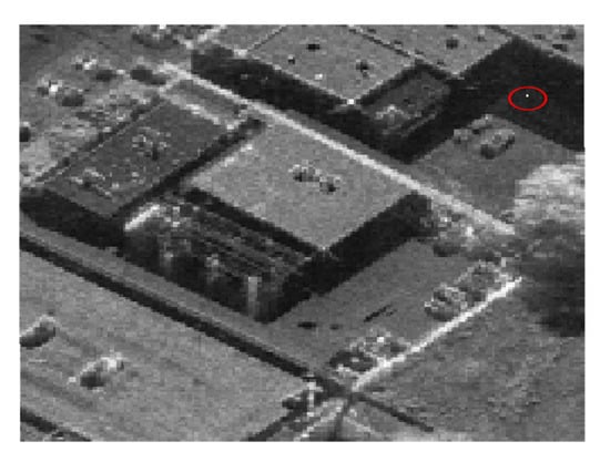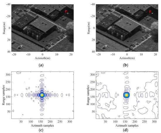 In order to further verify the superiority of the proposed imaging mode, a focused SAR image as shown in Figure 11 with 0.3 m resolution is selected as the reflectivity map for echo simulation and imaging process. Imaging simulation results of the designed scene in the conventional and proposed starring spotlight modes are shown in Figure 12a,b, while sidelobes in the proposed mode as shown in Figure 12a are obviously suppressed compared with the focused SAR image in the conventional starring spotlight mode as shown in Figure 12b, especially for strong scattering points. The strong scattering point P in both modes as shown in Figure 12a,b are interpolated, while their corresponding contour plots are shown in Figure 12c,d.