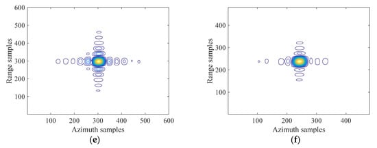 Echoes of the designed scene with nine point targets in the conventional starring spotlight and the proposed mode are shown in Figure 9b,c, respectively, while the raised cosine window factor for both NLFM generation and ANUS design in the proposed imaging mode is 0.3. Using the modified RMA processor as shown in Figure 8 without window weighting to handle the raw data, imaging results of both modes are shown in Figure 9c,f. Strong sidelobes of point targets could be obviously observed in Figure 9d, while sidelobes are well suppressed after window weighting in the conventional mode as shown in Figure 9e. However, without any window weighting in the both range and azimuth dimensions, sidelobes are also well suppressed in the proposed low sidelobe imaging mode as shown in Figure 9f.
