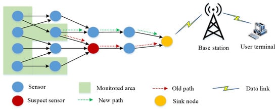 In environmental monitoring based on the IoT, there are many sensors used to monitor environment and transmit data (as shown in Figure 3). In such a large-scale system, sensor failure caused by software and hardware failure becomes inevitable. Thus, the system needs to know the status of sensors in a timely fashion to ensure the implementation of applications. For example, when a sensor fails (the red node is the failed node), all data transmitted through this node will not reach the destination. This means that the old path through the failed sensor is useless. If the system does not know how many such failed nodes exist, its availability will be greatly reduced. The purpose of a failure detector is to find the failed sensor in the system in time. By employing a failure detector, the system can find the failed sensor and then remove it from the system topology. Finally, the system builds a new path to transmit data using normal sensors. In the IoT, apart from sensor hardware and software failure, battery depletion is also an important failure factor in sensor failure.