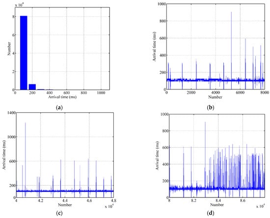 Analysis of actual data. (a) Distribution of arrival time, (b)Early stage of arrival time, (c) Middle stage of arrival time, (d) Late stage of arrival time.