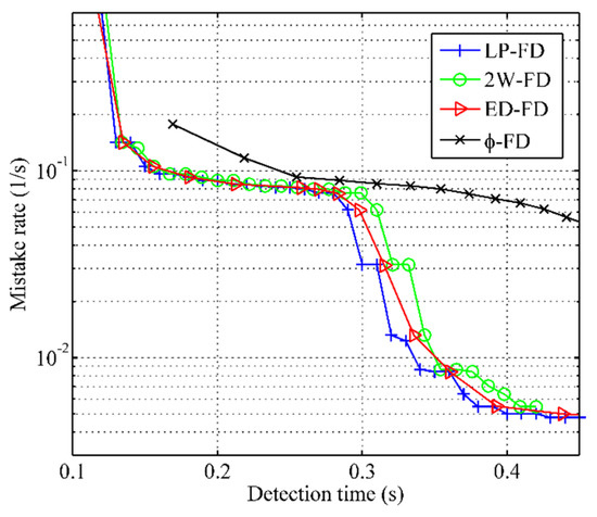 The experimental results of the mistake rate vs. detection time are shown in Figure 5. The x-coordinate is used to indicate the detection time, and the y-coordinate is used to indicate the mistake rate. From Figure 5, we can see that the mistake rate of all failure detectors decreases with an increase in detection time. However, our failure detector had a lower mistake rate than other failure detectors when they had the same detection time. This improvement is because our failure detector can catch most late heartbeat messages by freshpoint under the same network conditions. When , the mistake rate of our failure detector is similar to 2W-FD and ED-FD. This shows that our failure detector can ensure detection accuracy during rapid detection. When , the mistake rate of our failure detector had an obvious decrease compared with other failure detectors. This is because the calculation approach of the freshpoint can quickly adjust, so our failure detector adapts to the various network conditions better than other failure detectors.