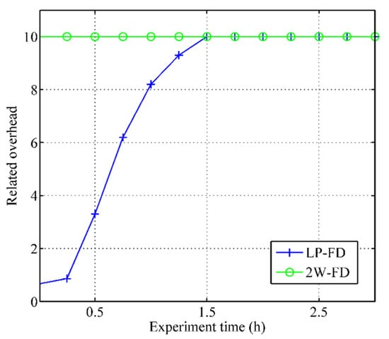 Figure 7 depicts the relative overhead comparison of two failure detectors. The 2W-FD represents the failure detector with a fixed detection period, while the LP-FD is the failure detector with a variable detection period. We observed that the 2W-FD with a fixed detection period introduced more traffic than our failure detector with a variable detection period in the early experiment (experiment time was less than 1.5 h). As time increases, the reliability of the sensor node decreases and the detection period becomes smaller; thus, the overhead of our failure detector continued to increase until it was the same as the failure detector with a fixed detection period.
