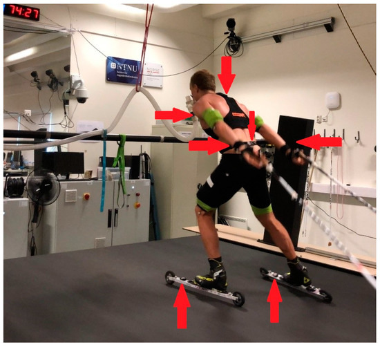 Overview of the experimental setup with an athlete skiing on the treadmill. Red arrows show the position of the sensors.