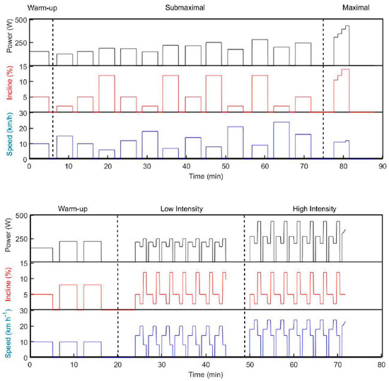 Day 2 consisted of a 13 min warm-up before two 21 min stages of (a) low and (b) high (competition) intensity, with freely chosen technique across a simulated terrain profile on the treadmill. The track was organized as seven identical 3 min laps, consisting of four different segments that simulated a moderate uphill (5% incline), a flat segment (2% incline), a steep uphill (12% incline) and a simulated downhill (Figure 1). The profile of the track was designed according to standards of the International Ski Federation [30], where the standard sub-techniques could naturally be utilized. The high-intensity stage was immediately followed by an incremental all-out test at 5% incline, with gradually increasing speed (+1 km−1) every 15 s until exhaustion (Figure 2).