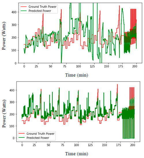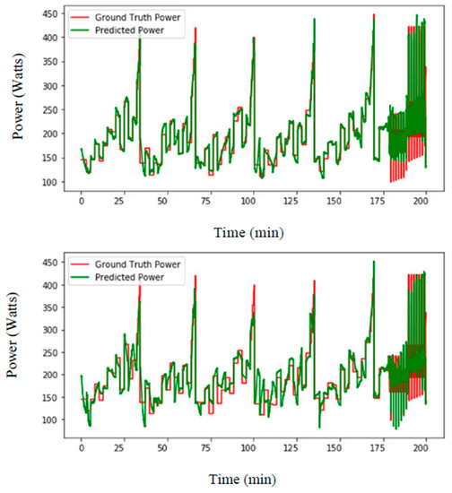 LSTM-based prediction of ski power (watts) with data from separate training and testing subjects (top) excluding and (bottom) including masses of the athletes where no data from the testing subjects were introduced in training.