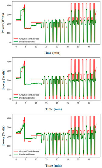 Long Short-Term Memory (top), typical large Artificial Neural Network (middle), and Convolutional Neural Network (bottom)-based prediction of ski power (watts) from the data of both days from subject 9, with training data of both days from other subjects.