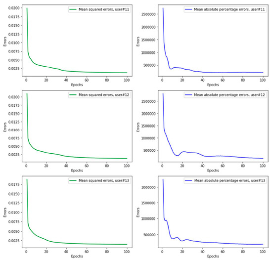 Mean-squared errors and mean absolute percentage errors with respect to 100 epochs from training models during the leave-one-subject-out method for cross-validation of subjects (top) 11, (middle) 12 and (bottom) 13.