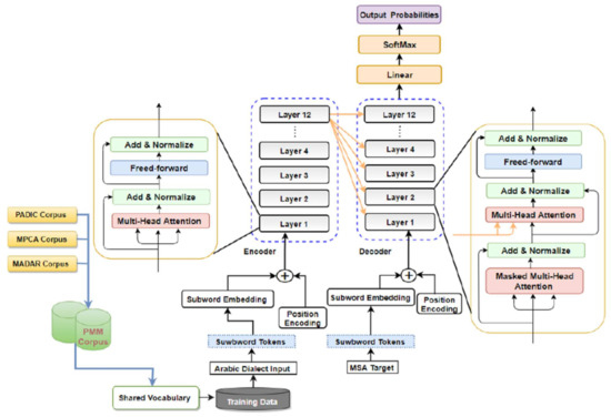 In Arabic dialects, the translation of rare words is a clear problem. Typically, there are 30,000–50,000 words confined to the neural model’s vocabulary. Nonetheless, translation is an open-vocabulary problem, mainly in languages that use productive word-formation processes such as compounding and agglutination; models of translation require methods below word level. For instance, in word-level NMT systems, the translation for the out-of-vocabulary words was discussed via back-off to a dictionary lookup [2,3]. We note that these techniques usually make incorrect assumptions in reality. For instance, due to the differences in the morphological synthesis between Arabic vernacular and modern standard Arabic language, one-to-one connection between source words and target words is not constantly occurring. Furthermore, word-level NMT systems are ineffective in translating and generating unseen words. One of the approaches is to copy unknown words into the target text as done by [2] and [3]. It is a suitable strategy for names, but it requires transliteration and morphological changes, particularly when the characters are different. In the case of transformer model that was proposed newly [4], it has outperformed recurrent neural network (RNN)-based models [5,6,7] and convolutional neural network (CNN)-based models [8] on various translation tasks, drawing the attention of MT researchers. The Transformer model, which applies a self-attention approach to measure the strength of a relationship within two words in a sentence, has contributed to raising performance in MT and various natural languages processing tasks, for instance, semantic role labeling and the language modeling. The techniques to tackle the difficulties of Arabic vernaculars translation are under research and investigation. There has been no earlier research project that concentrated exclusively on developing a Transformer-based NMT model running from Arabic vernaculars to modern standard Arabic language at the level of subword units.