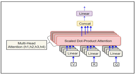 where and are projections of query, key and value vectors for head, respectively. These projections are made with metrics , , . The inputs to the MHA(.) are , and . is the output of measured dot product calculation for the head. The measured dot product operation are united by using the concatenation function to generate . Eventually, the output is produced from the projections of utilizing the weight matrix . The MHA contains the same number of parameters as vanilla attention if