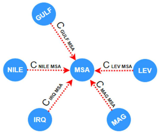 For the translation tasks, we grouped the Maghrebi vernaculars (Moroccan vernacular, Algerian vernacular, Tunisian vernacular and Libyan vernacular) unitedly from PADIC corpus [17], MPCA corpus [43] and MADAR corpus [44] into a single corpus, we will name it PMM-MAG. The Levantine vernaculars (Jordanian vernacular, Syrian vernacular, Lebanese vernacular and Palestinian vernacular), which are grouped collectively from PADIC corpus, MPCA corpus and MADAR corpus are grouped into a single corpus, and we will name it PMM-LEV. Furthermore, we concatenated Nile Basin Dialects (Egyptian vernacular, Sudanese vernacular) from MADAR corpus and the Gulf Dialects (Saudi Dialect, Omani Dialects and Qatari Dialect) are concatenated together from the same corpus. Moreover, we used the MADAR Corpus for the translation task of the Iraqi dialect. Figure 3 presents an example translation graph with nodes and dotted edges. We will use this graph as our running example. The Transformer NMT subword system was trained on 36,850 sentence pairs for Levantine vernacular, 54,736 sentence pairs for Maghrebi vernacular, 18,000 sentence pairs for Nile Basin Dialect, 18,000 sentence pairs for Gulf vernacular and 5000 sentence pairs for Iraqi vernacular. Textual information was gathered from many resources such as television episodes, films and social media. Regarding the test dataset, the proposed system was tested on 3000 sentence pairs for Levantine vernaculars, 3000 sentence pairs for Maghrebi vernacular, 2000 sentence pairs for Nile Basin vernacular, 2000 sentence pairs for Gulf vernacular, and 1000 sentence pairs for Iraqi vernacular. Moreover, the suggested system was trained with 13,805 sentence pairs for Levantine vernacular and it was trained on 17,736 sentence pairs for Maghrebi vernacular from the same corpus that was utilized by Baniata et al. [22] and tested on 2000 sentence pairs for Levantine vernacular and 2000 sentence pairs for Maghrebi vernacular.