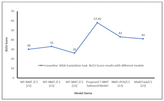 The influence of utilizing subword units and shared vocabulary between Arabic dialects and MSA and applying the self-attention mechanism on translation quality for Arabic vernaculars is significantly evident. The proposed Transformer-Based NMT Subword model is well-suited to handle the issue of free word ordering and create a right context and a correct order for the target language sentences, as illustrated in Table 11 and Table 12. Furthermore, the proposed system can obtain excellent translation effectiveness with various language pairs, as illustrated in Table 11 and Table 12 for MAG–MSA, LEV–MSA, Nile–MSA, Gulf–MSA and IRQ–MSA tasks. The proposed model was evaluated on the same parallel corpus that was applied by Baniata et al. [22] for Maghrebi Arabic and Levantine Arabic. Compared to the multitask NMT with part of speech tags system that was trained on the same parallel corpus, the suggested Transformer NMT subword system scored an effectiveness of 56.49 BLEU score for translating from Levantine Arabic vernacular to MSA and 57.06 BLEU score for translating from Maghrebi Arabic vernacular to MSA. The findings show that the proposed Transformer NMT subword model performs outstanding translation quality than the multitask NMT with part of speech (POS) tagging system by evaluating the systems using BLEU score and experiments of human assessment.